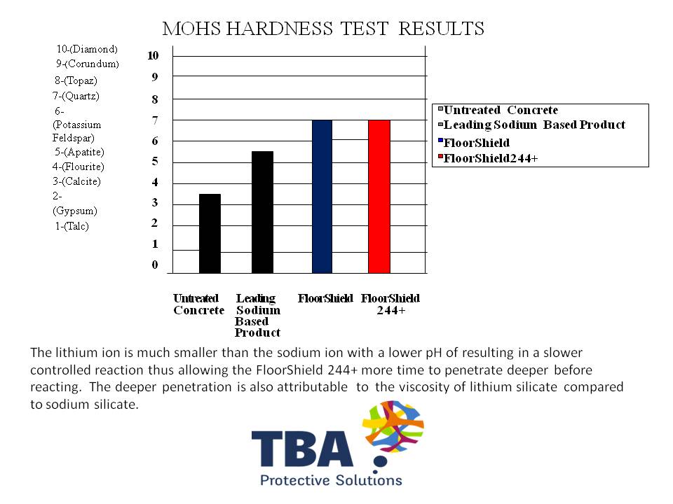 A further test on the Hardness of the Concrete compared with a leading sodium based product, illustrating that the lithium within the FloorShield product, allows the FloorShield to penetrate deeper within the concrete before reacting.